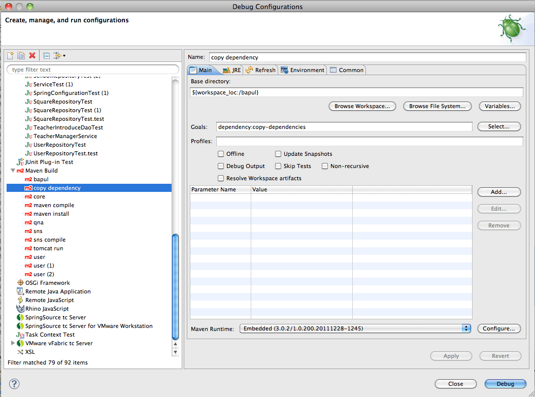 ouputDirectory 라는 텝은 어디로 maven dependency 를 카피할 지 알려주는 경로이다.